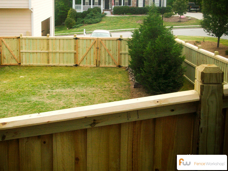 This privacy fence design is fully framed with MCQ™ pressure treated pine lumber. This fence uses concreted 4×4 posts exposed with FRENCH GOTHIC tops, [3] horizontal 2×4 frame rails, 6″ shadowbox pickets cut at an arch every 8’wide section.
