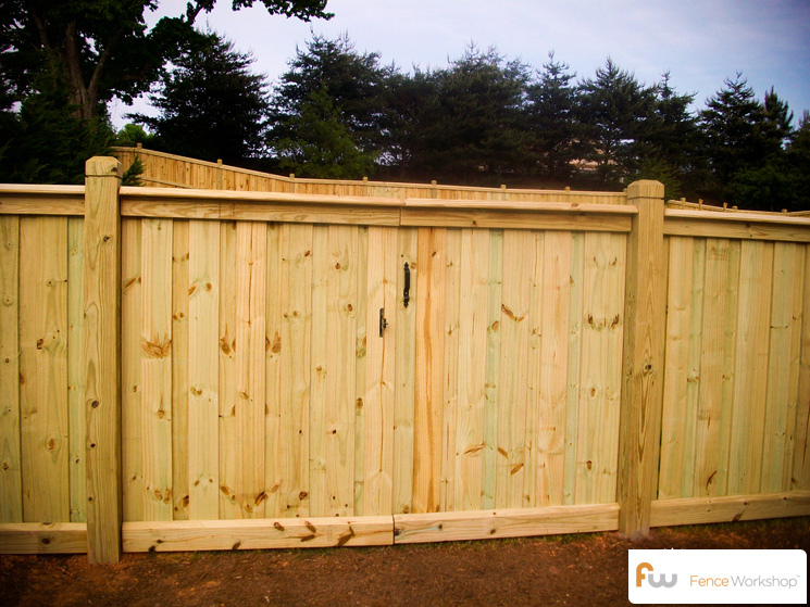 This privacy fence design is fully framed with MCQ™ pressure treated pine lumber. This fence uses concreted 4×4 posts exposed with FRENCH GOTHIC tops, [3] horizontal 2×4 frame rails, 6″ shadowbox pickets cut at an arch every 8’wide section.