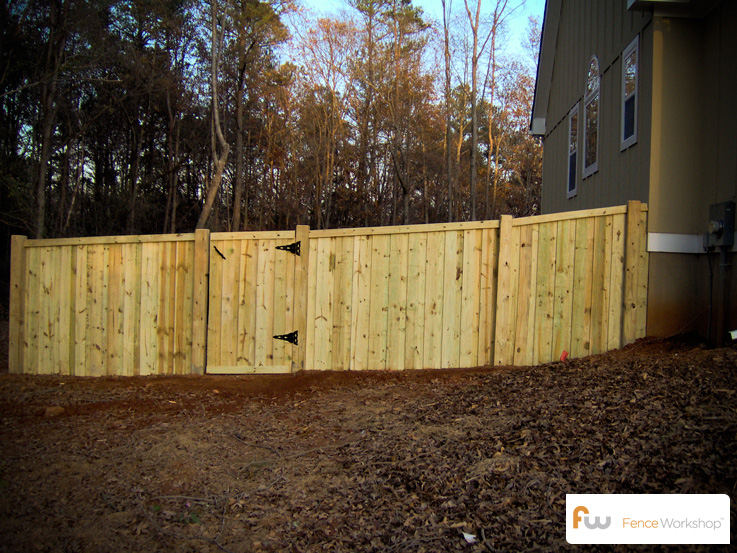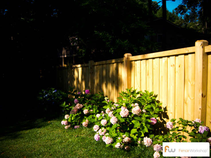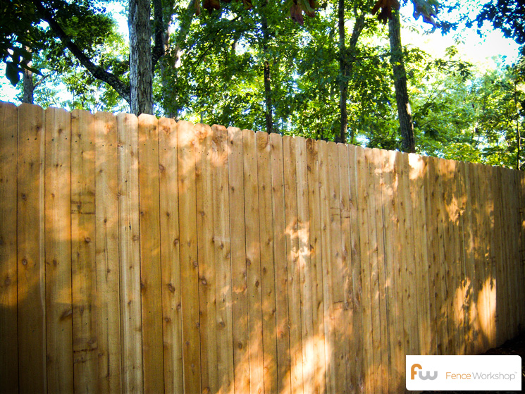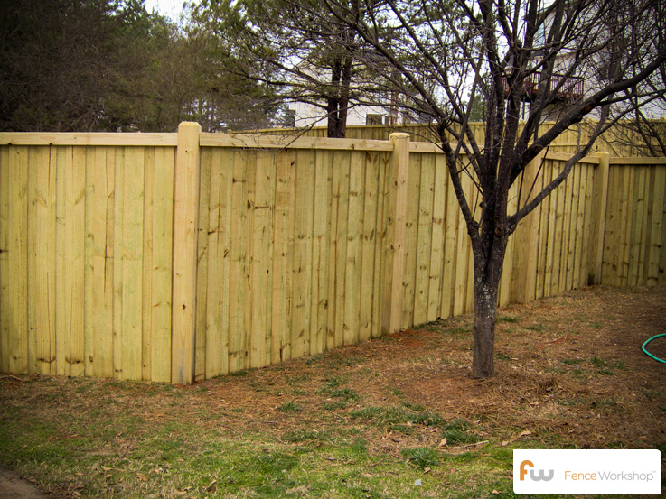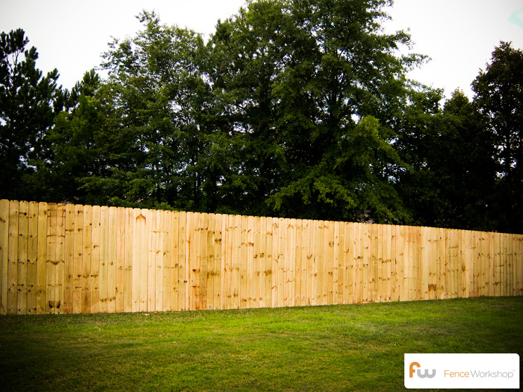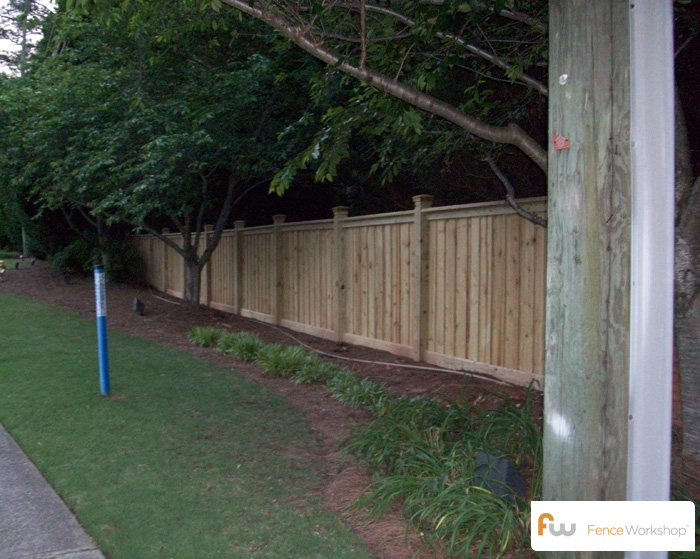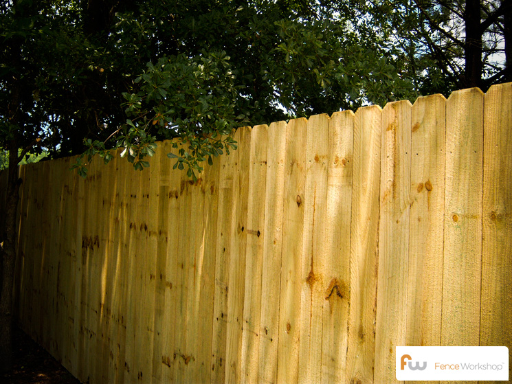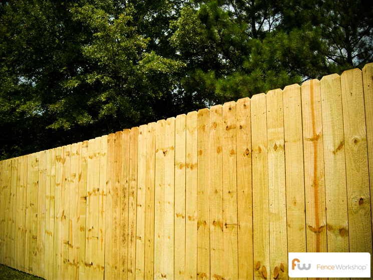 This dog eared wood privacy fence design is fully constructed with MCQ™ pressure treated pine lumber. This fence uses concreted 4×4 post, [3] horizontal 2×4 frame rails, 6″ dog eared pickets. This is our most basic wood privacy fence.