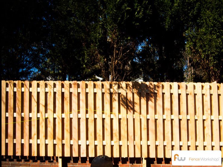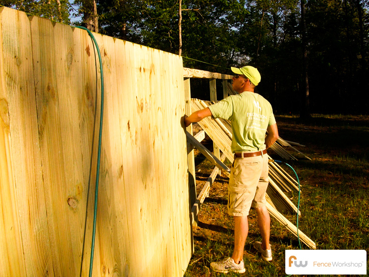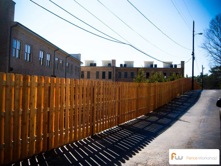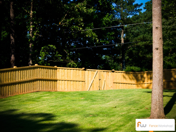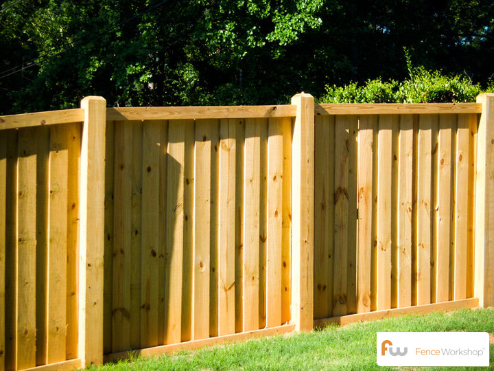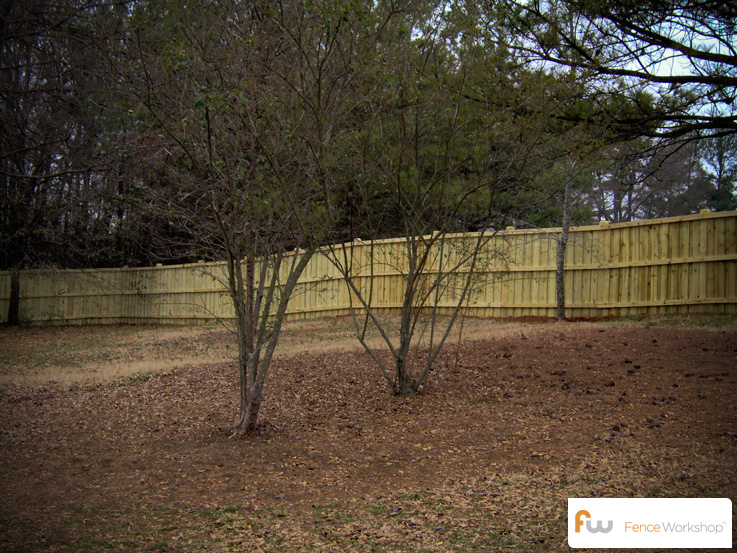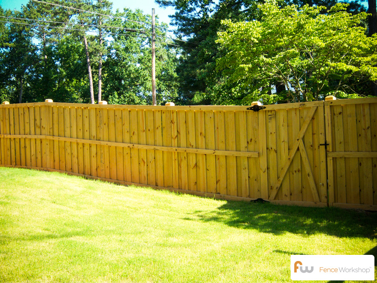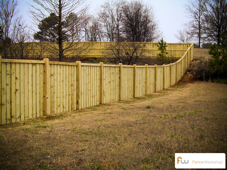 This dog eared wood privacy fence design is fully constructed with MCQ™ pressure treated pine lumber. This fence uses concreted 4×4 post, [3] horizontal 2×4 frame rails, 6″ dog eared pickets. This is our most basic wood privacy fence.