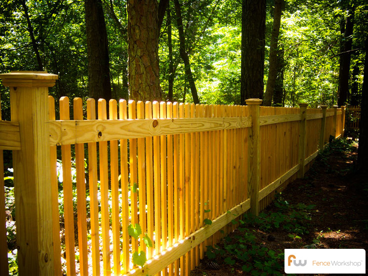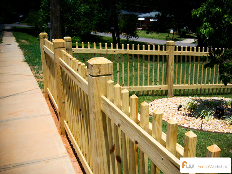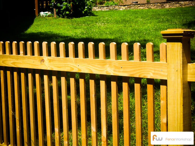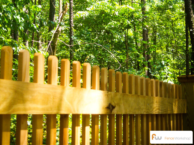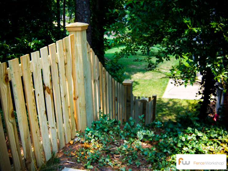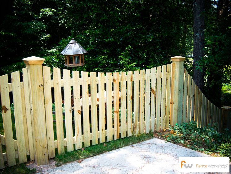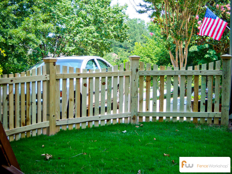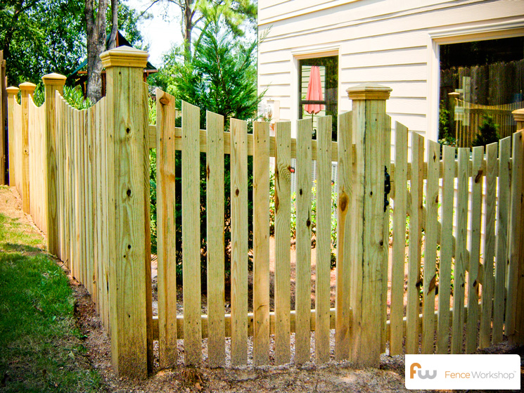 This 4′ tall scalloped wood picket fence design is fully frame with MCQ™ pressure treated pine lumber. This fence uses concreted 6×6 post exposed with wooden post caps, [2] horizontal 2×4 frame rails, and 2×2″ negative arch cut pickets.