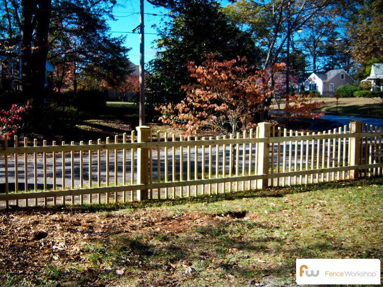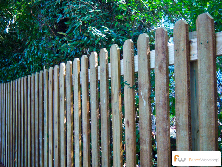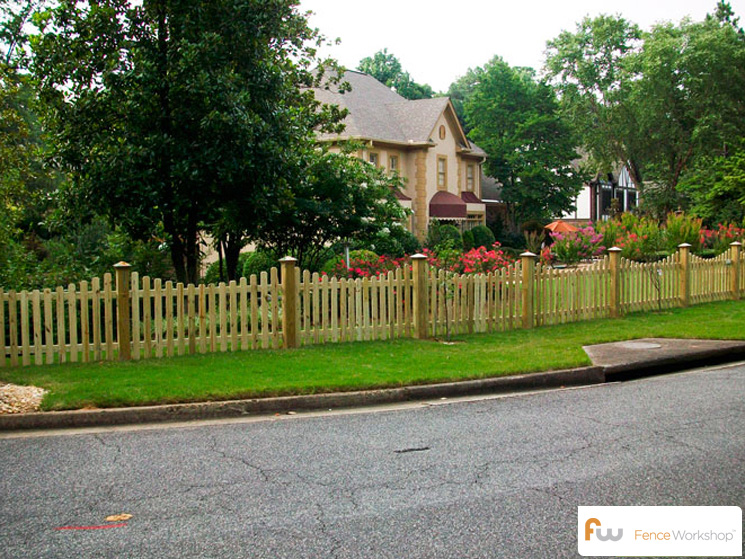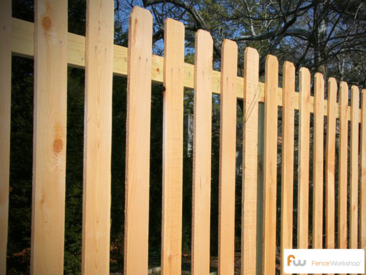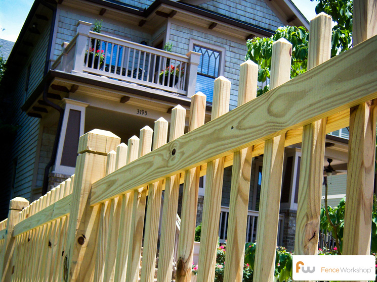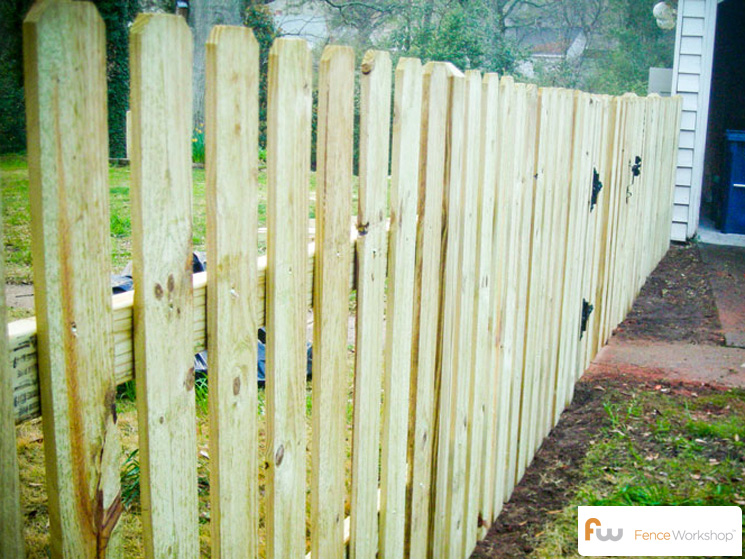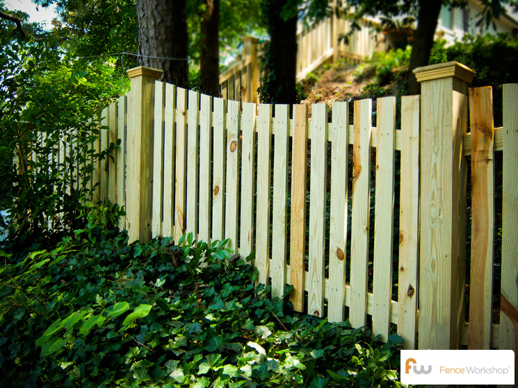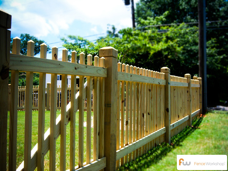 This 4′ tall scalloped wood picket fence design is fully frame with MCQ™ pressure treated pine lumber. This fence uses concreted 6×6 post exposed with wooden post caps, [2] horizontal 2×4 frame rails, and 2×2″ negative arch cut pickets.