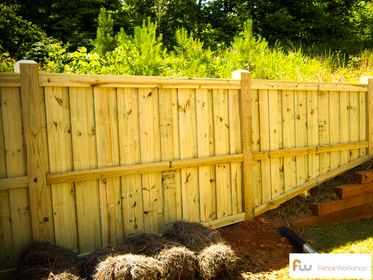 This dog eared wood privacy fence design is fully constructed with MCQ™ pressure treated pine lumber. This fence uses concreted 4×4 post, [3] horizontal 2×4 frame rails, 6″ dog eared pickets. This is our most basic wood privacy fence.