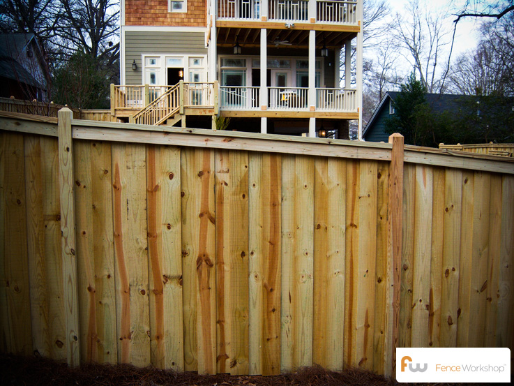This 6’tall privacy fence design is fully framed with MCQ™ pressure treated pine lumber. This fence uses concreted 4×4 posts exposed and beveled, [3] horizontal 2×4 frame rails, 6″ board on board dog eared pickets, 2×4 top cap, and 1×4 top fascia board.