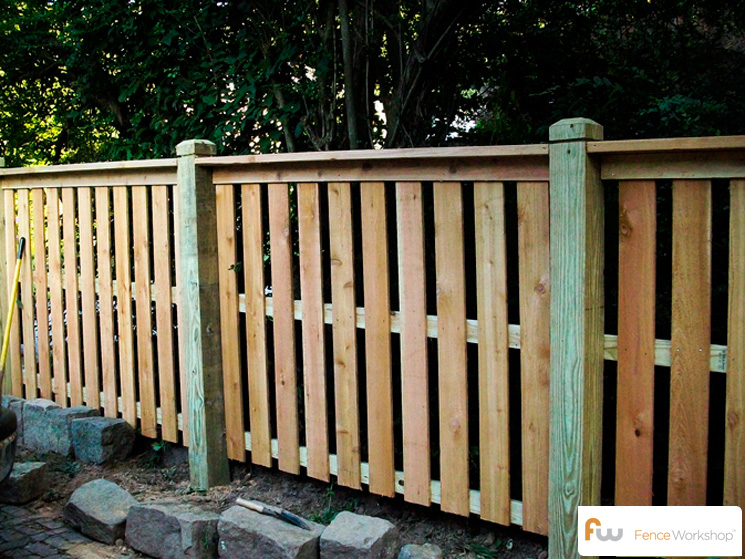 This 6′ tall picket fence design is fully frame with MCQ™ pressure treated pine lumber. This fence uses concreted 6×6 post exposed with dado top, [3] horizontal 2×4 frame rails, 6″ pickets, 1×4 top fascia board and a 2×6 top cap.