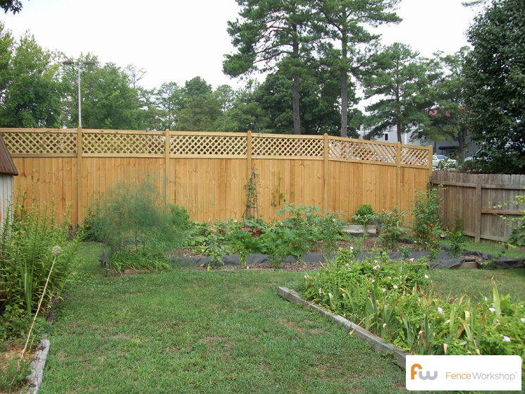 This privacy fence design is fully framed with MCQ™ pressure treated pine lumber. This fence uses concreted 4×4 posts, [4] horizontal 2×4 frame rails, 6″ pickets, lattice panels,beveled post tops