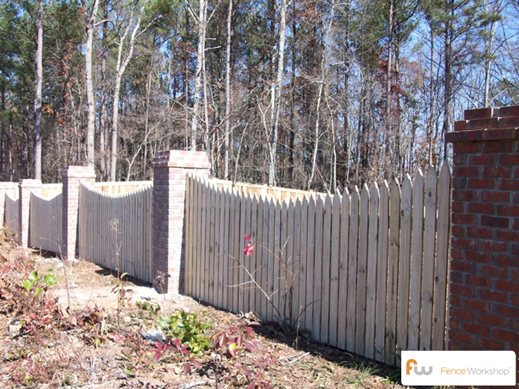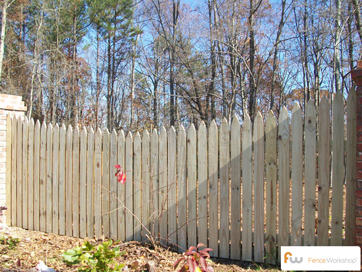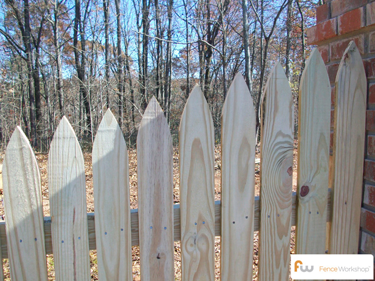 This 4′ tall scalloped picket fence design is fully frame with MCQ™ pressure treated pine lumber. This fence uses concreted 4×4 post , [2] horizontal 2×4 frame rails, 4″ bullet point pickets at a negative arch cut from the bottom.
