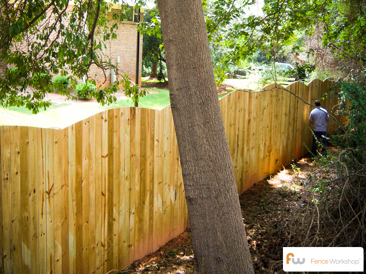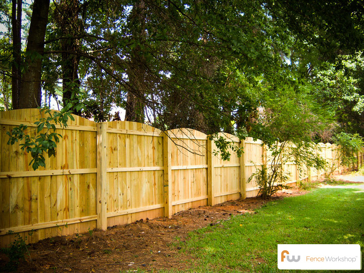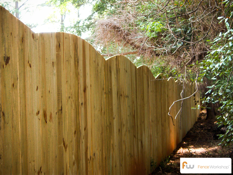 This privacy fence design is fully framed with MCQ™ pressure treated pine lumber. This fence uses concreted 4×4 posts, [3] horizontal 2×4 frame rails, 6″ pickets cut at an arch every section.