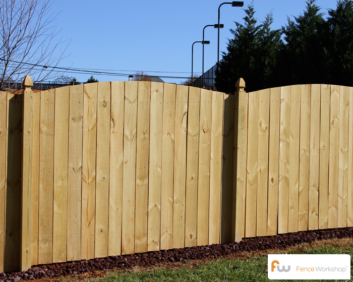 This privacy fence design is fully framed with MCQ™ pressure treated pine lumber. This fence uses concreted 4×4 posts exposed with FRENCH GOTHIC tops, [3] horizontal 2×4 frame rails, 6″ shadowbox pickets cut at an arch every 8’wide section.