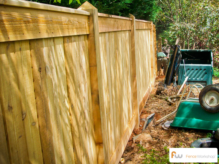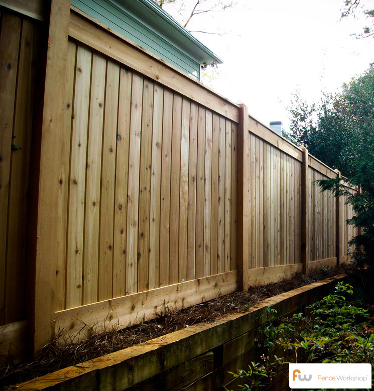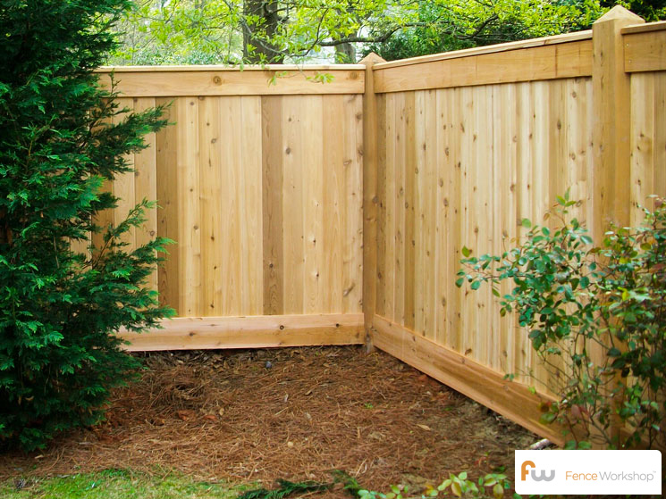 This Custom CEDAR privacy fence design is fully constructed with Western Red CEDAR lumber. This fence uses concreted 6×6 protected CEDAR posts exposed with chamfered top, CEDAR 1×6 top fascia boards, CEDAR 1×8 bottom fascia boards, 6″ tongue and groove CEDAR pickets, 2×4 custom beveled CEDAR top cap board.