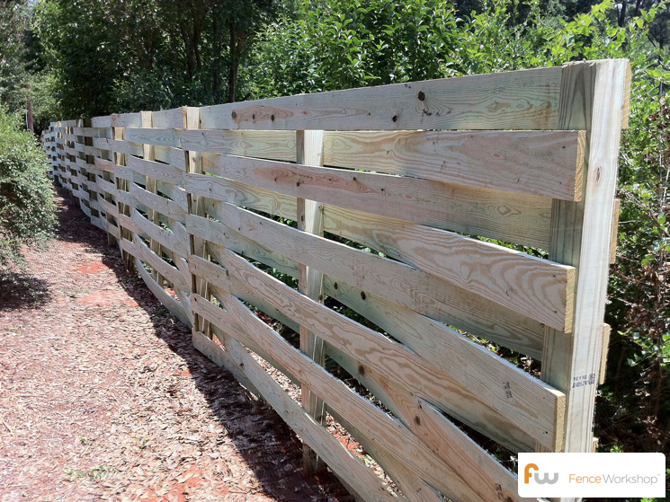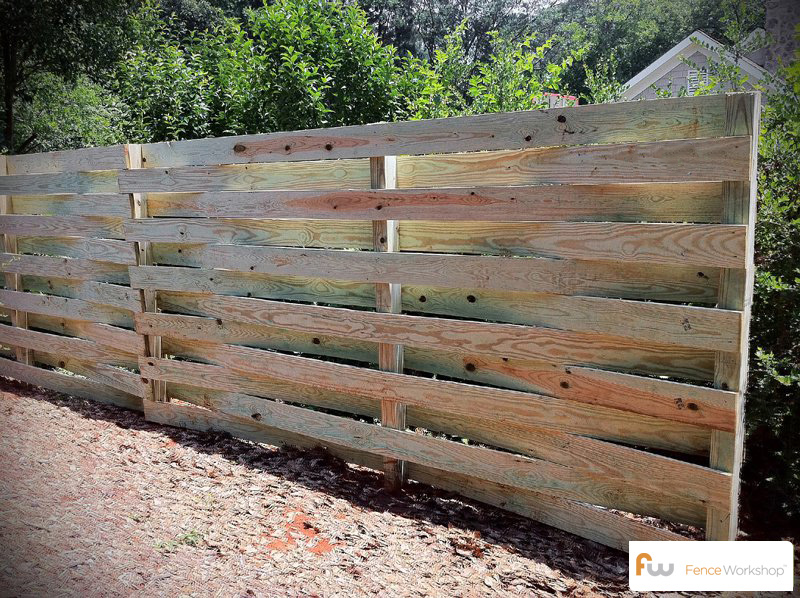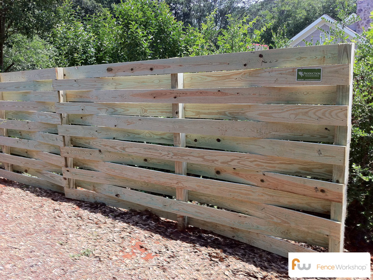 This privacy fence design is fully framed with MCQ™ pressure treated pine lumber. This fence uses concreted 4×4 posts and 6″ horizontal boards installed with an alternating “basket weave” pattern.