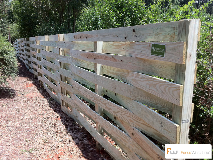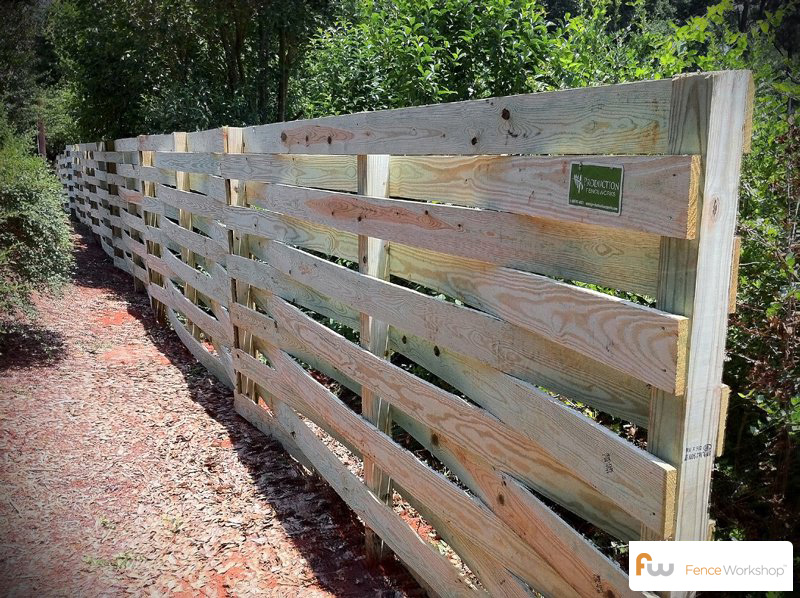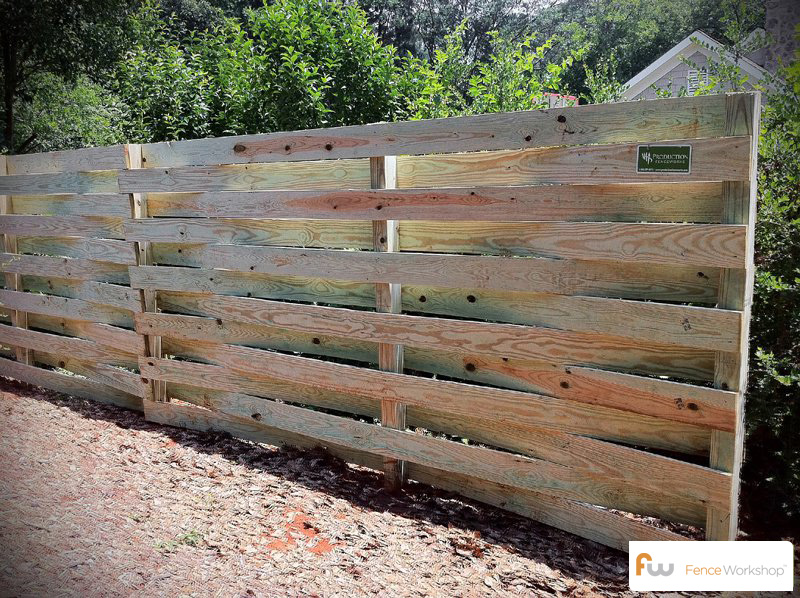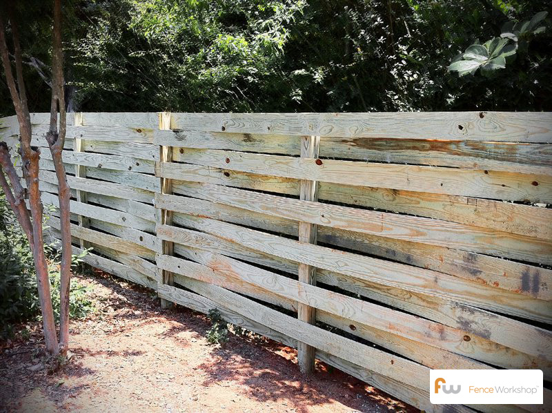 This privacy fence design is fully framed with MCQ™ pressure treated pine lumber. This fence uses concreted 4×4 posts and 6″ horizontal boards installed with an alternating “basket weave” pattern.