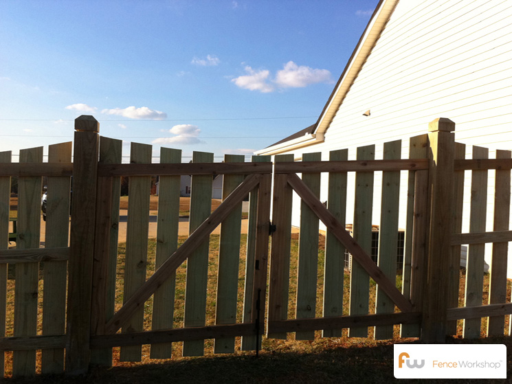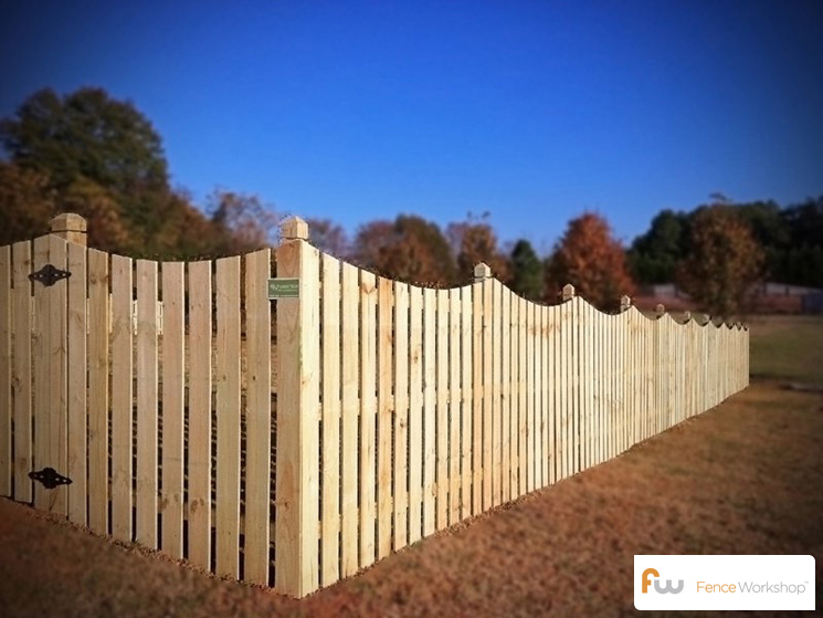 This scalloped semi-privacy fence design is fully frame with MCQ™ pressure treated pine lumber. This fence uses concreted 4×4 post exposed with french gothic tops, [2] horizontal 2×4 frame rails, and 4″ french gothic pickets. The referenced pictures are an upgraded version of this style- the upgrade is the arched sections.